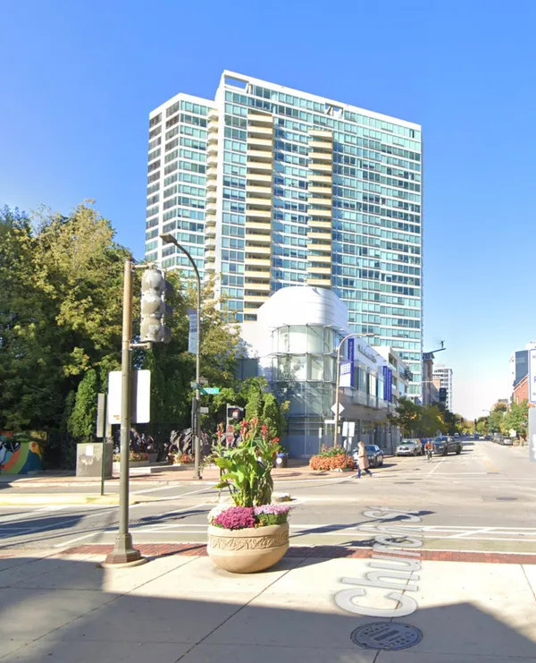 Optima Views is the premier residential condominium building in Evanston. This 28-story concrete and glass building was designed with a unique angled face that maximizes views of Lake Michigan and the downtown Chicago skyline, which helped earn it a Distinguished Building Award from the Chicago Chapter of the American Institute of Architects in 2005. The distinctive entry courtyard welcomes residents and guests with a paved walk, reflecting pond, and fountain leading to the glass-enclosed lobby and elevators.